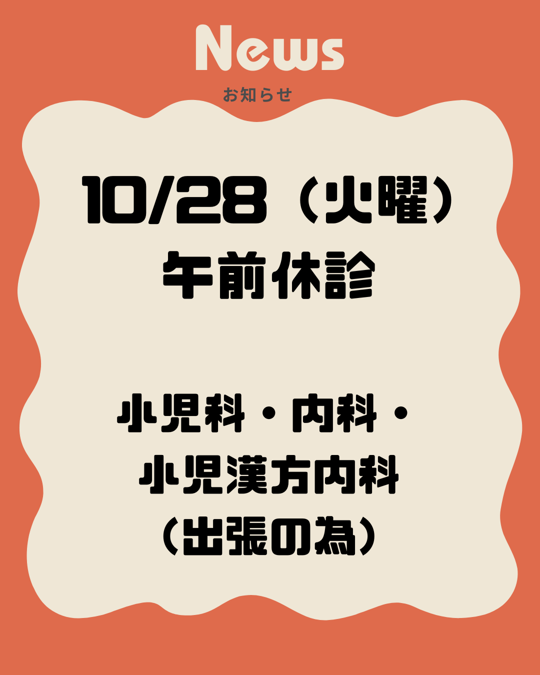 10/28(火)の小児科、内科の午前診療ですが、高橋先生が出張のため、急遽休診とさせて頂きます。