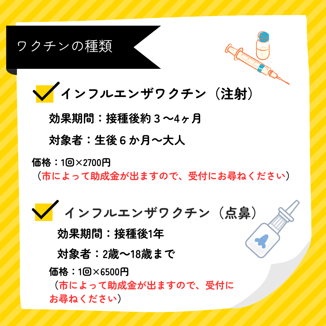 今年も通常の注射タイプと、2~18歳までのお子さん用に点鼻タイプのインフルエンザワクチンをご用意しております。